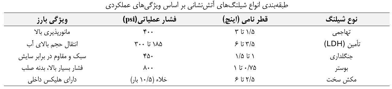شیلنگ‌های آتش‌نشانی بر اساس دبی مورد نیاز، فشار عملیاتی و ماهیت منبع تأمین آب به دسته‌های مختلفی تقسیم می‌شوند که هر یک الزامات طراحی خاص خود را دارند.