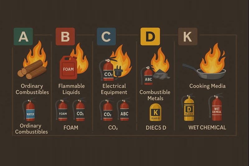 راهنمای کلاس های آتش A، B، C، D، و K و انتخاب صحیح کپسول آتش‌نشانی