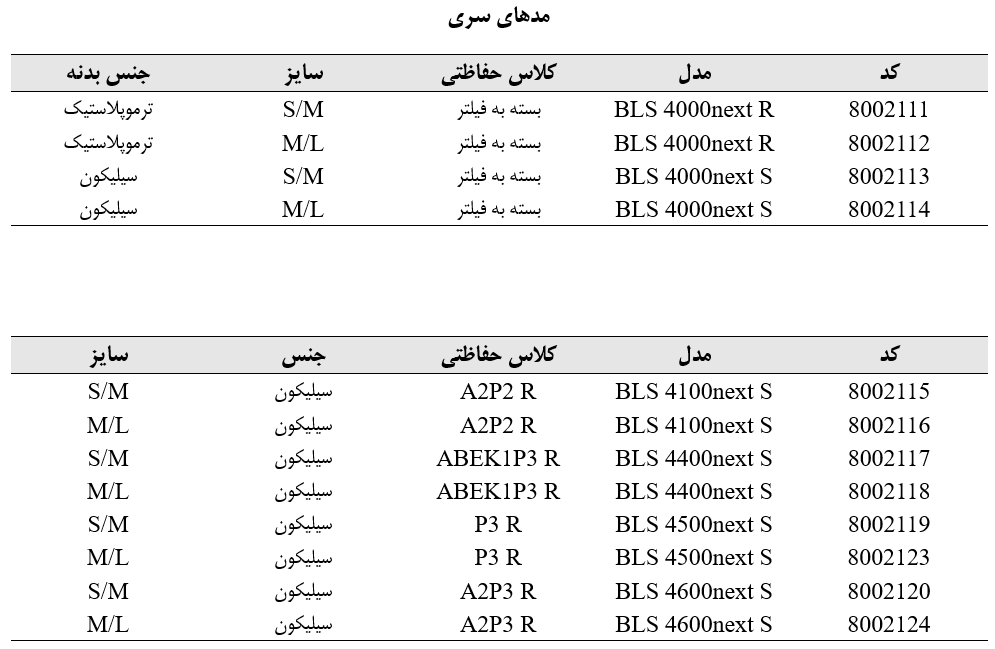 ماسک نیمصورت BLS 4000 next R با بند نگهدارنده سبک و باریک خود، با سایر تجهیزات حفاظت فردی (PPE) کاملا هماهنگ بوده و مطابق با استاندارد اروپایی EN 140:1998/2004 تولید شده است. دارا بودن نشانهای CE و EAC تضمینی بر کیفیت ساخت و ایمنی بالای این محصول است. این ماسک، بسته به نوع فیلتر انتخابی (فیلترها بهصورت جداگانه عرضه میشوند)، محافظتی مؤثر در برابر گازها، بخارات و ذرات معلق ارائه میدهد و برای طیف وسیعی از مشاغل از جمله ساخت و ساز، تولید صنعتی، رنگ آمیزی و صنایع سبک و سنگین گزینهای مناسب محسوب میشود. همچنین برای سهولت انتخاب، کیتهای (بستههای آماده استفاده) آماده مصرف مانند مدلهای 4100 next و 4400 next با فیلترهای اختصاصی برای کاربردهای رایج در دسترس هستند.